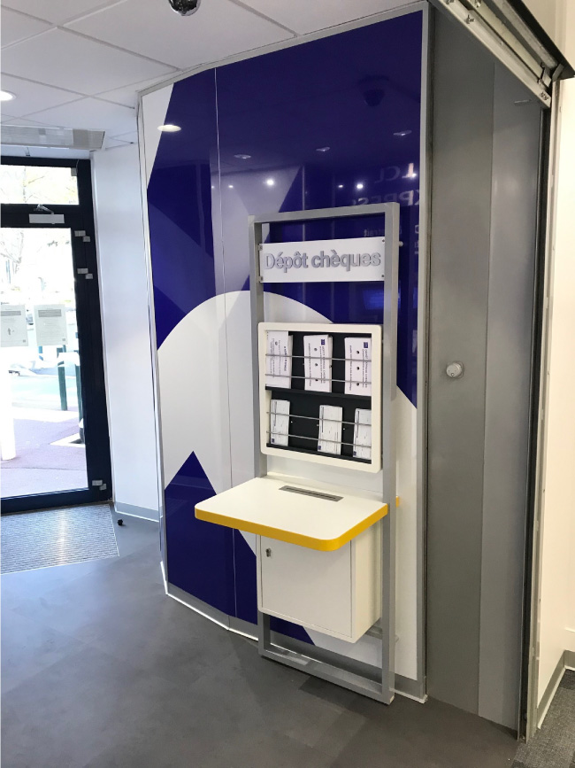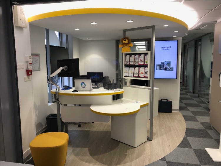 Ateliers de Chevreuse accompagne sur 2021-2022 le LCL dans la transformation de ses agences sur la région Ile de France et sur tout l’Est de la France sur un concept de mobiliers innovants à travers un poste accueil situé au centre de l’espace mais aussi des supports écrans, des mobiliers remise de chèques et des présentoirs supports Leaflet.